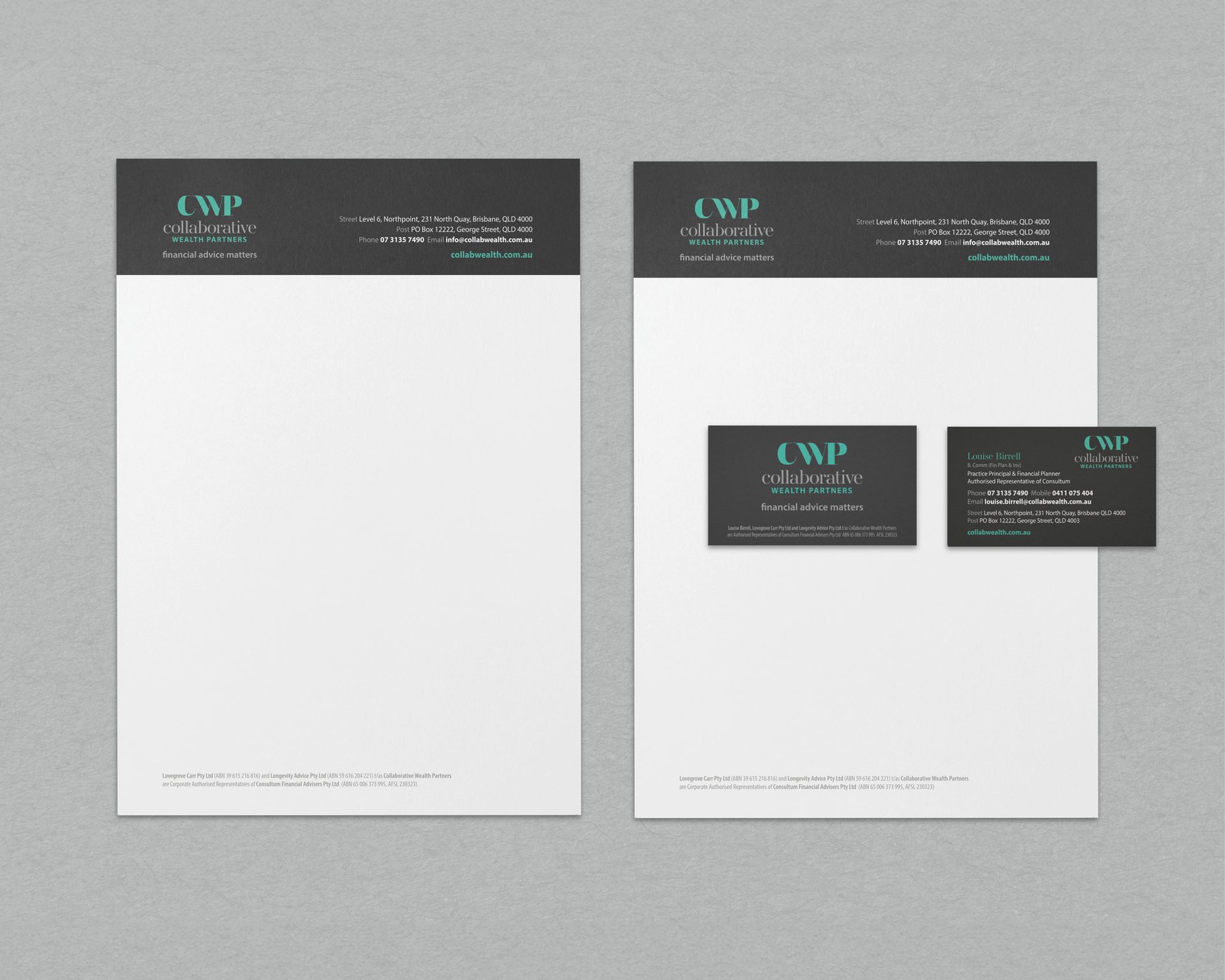 Collaborative Wealth Partners sought a simple, elegant, and timeless brand. We designed a custom typographical symbol using the letters CWP, creating a concise version of the business name. The linked letters represent partnership, connection, and collaboration. Teal adds freshness and vibrancy to the brand, while light and dark grey provide sophistication and strength.